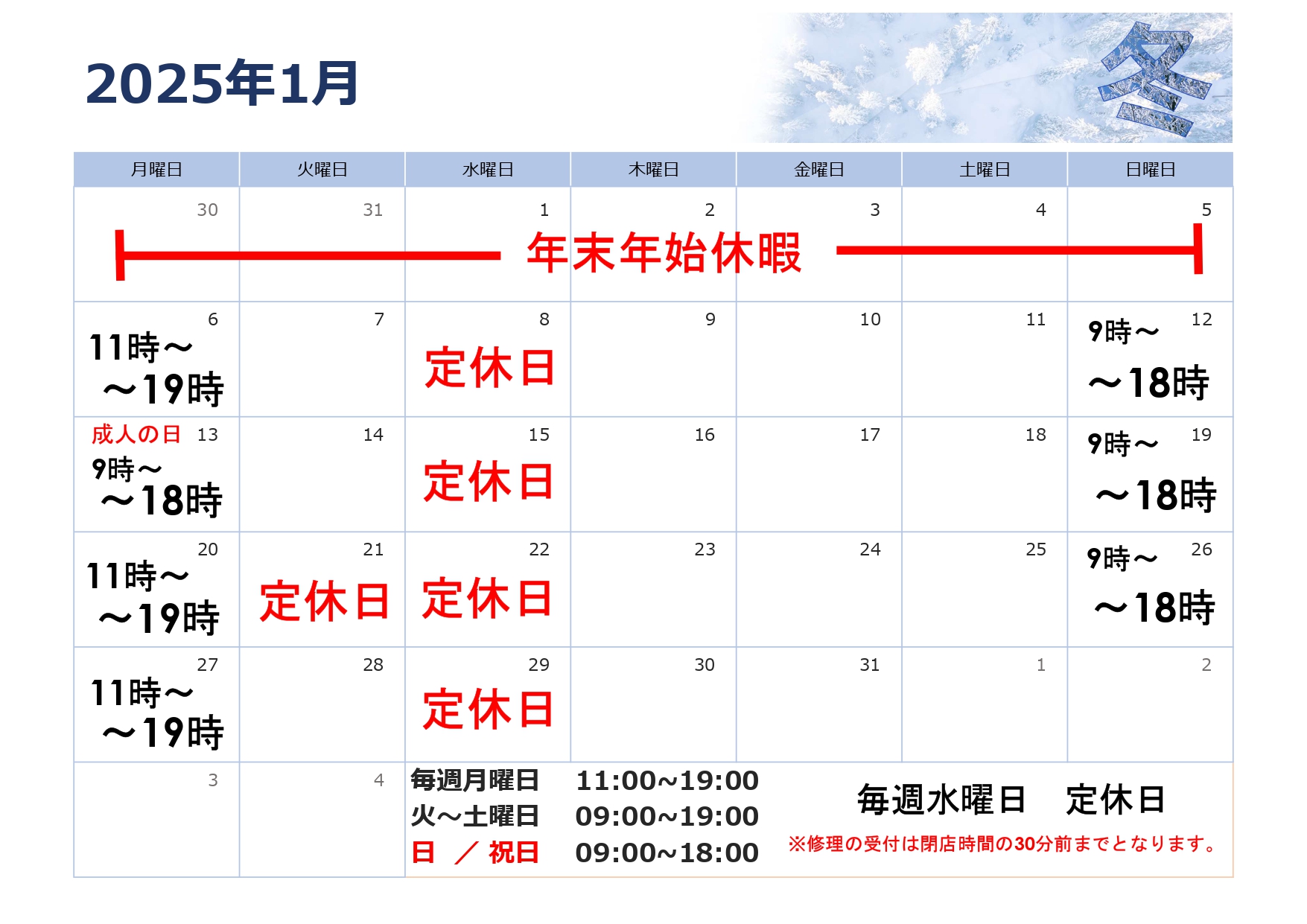 定休日、営業時間のお知らせ